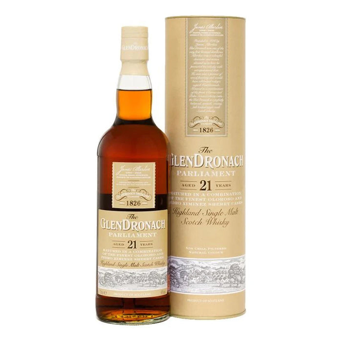 Experience the exquisite taste of GlenDronach Parliament 21 Year Old Scotch Whisky, a true masterpiece for whisky connoisseurs. This exceptional Scotch is matured for a minimum of 21 years in a combination of the finest Oloroso and Pedro Ximenez sherry casks, delivering a rich, fruit-laden intensity that is a hallmark of GlenDronach's tradition.